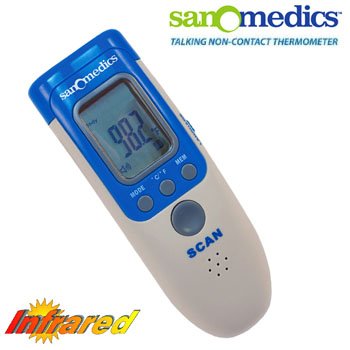 Scan thermometer provides one second results in English, French, Spanish- or silence. Simply aim the unit 2 inches from the skin at the forehead (over the right temple), press the button, and the temperature is displayed on a large, backlit digital screen. Measures room, surface or body temperature in ºF or ºC, with memory of the last 32 readings. Features an alarm for readings above "normal" range and automatic shut-off. Includes user manual, two AAA batteries, and storage pouch. 1-year warranty.