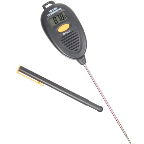 This Talking Digital Thermometer says the temperature in a female voice at the press of a button and displays it in bold black LCD digits on the easy-to-read display. It's great for blind or low vision users and tasks where you can't read the display. Numerous uses around the house include cooking, checking bath water, hobbies and gardening. Super-fast - tapered tip reads in about 5-6 seconds. Includes protective probe cover with hanging clip. TECHNICAL SPECIFICATIONS: - Resolution: Readings given in 0.1-degree increments - Choose Fahrenheit or Celsius - LCD Display Size: 1 in. long x 0.5 in. wide - Probe length: 4.9 in. - Range: -58 to 572 degrees Fahrenheit (-50 to 300 degrees Celsius) - Automatic Power Off: After idle for 10 minutes - Uses 2 AAA batteries (included) - Battery Life: About 4,000 hours in standby mode Product Measurements (including probe): 9.25" long x 2" wide x 1.2" deep Product Weight (with batteries installed): 2.5 oz. Weight in Original Packaging: 3.8 oz.